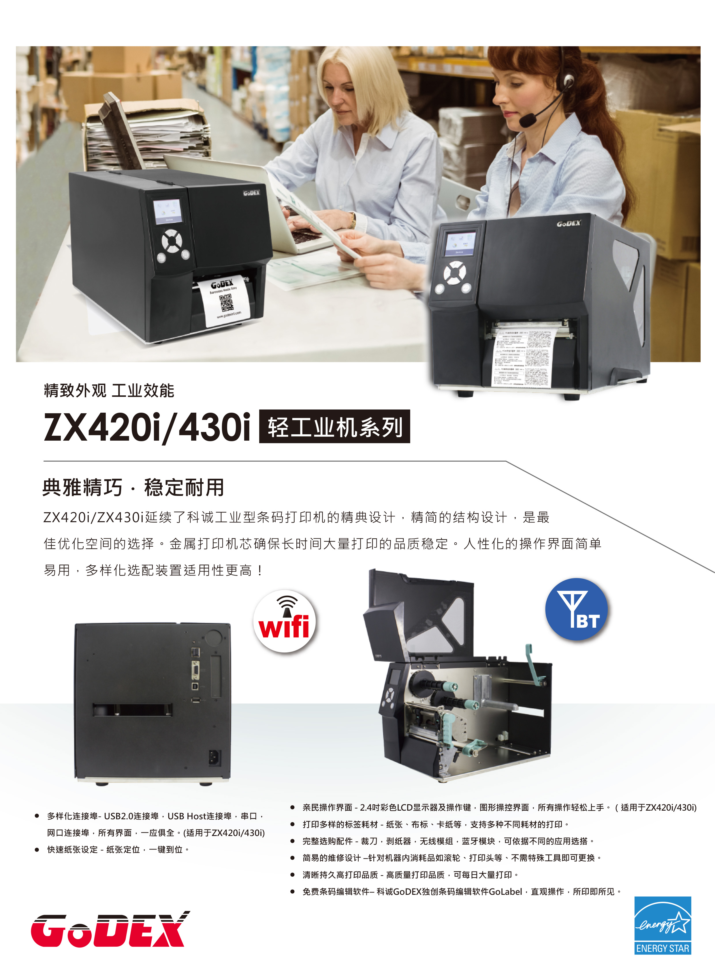 典雅精巧,稳定耐用 ZX400i系列延续了科诚工业型条码打印机的经典设计,精简的结构设计,是最佳优化空间的选择。